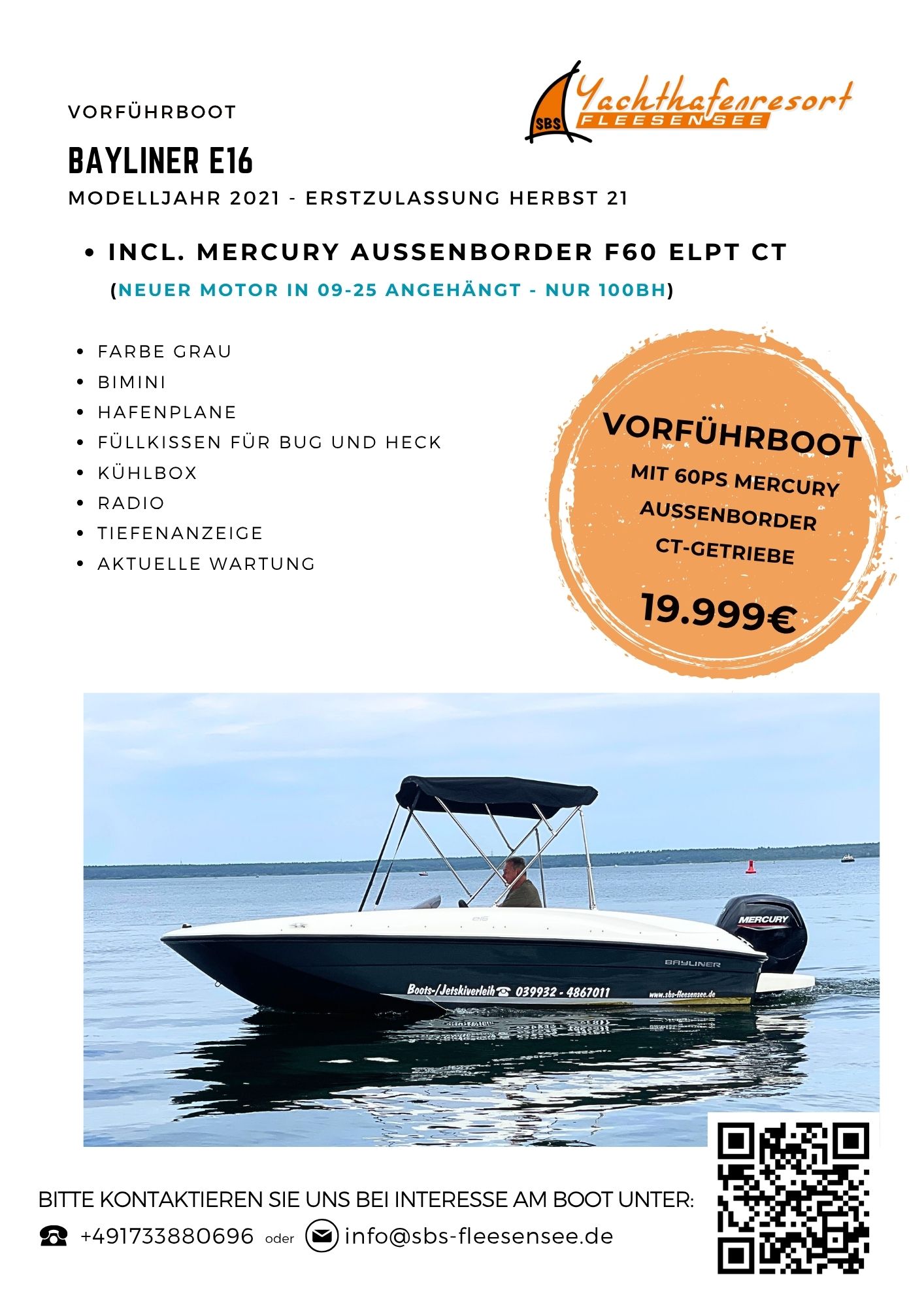 Bayliner Element E16 aus dem Verleih incl. Mercury Außenborder FF60 ELPT CT